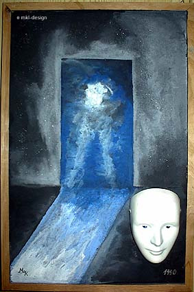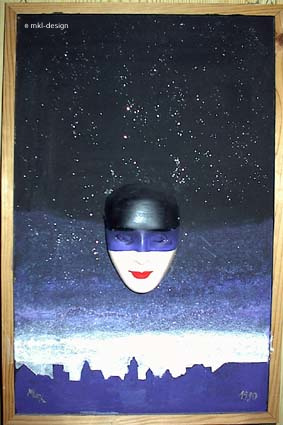 Der Nachteil bei der Arbeit mit Korkwänden ist die Leichtigkeit der Bilder. Da manche der Masken (Der Rosenkavalier) schwer waren, mussten sie an Nägeln befestigt werden, die ich dann durch die Korkfläche durchschlug.