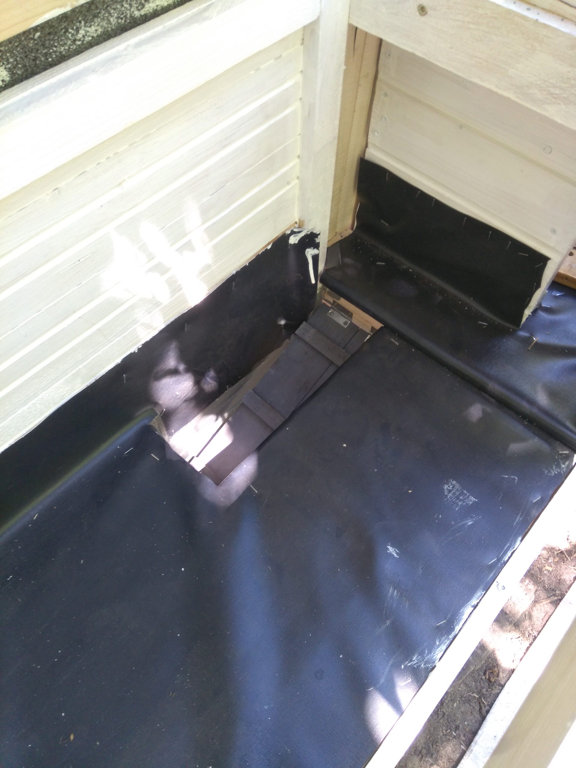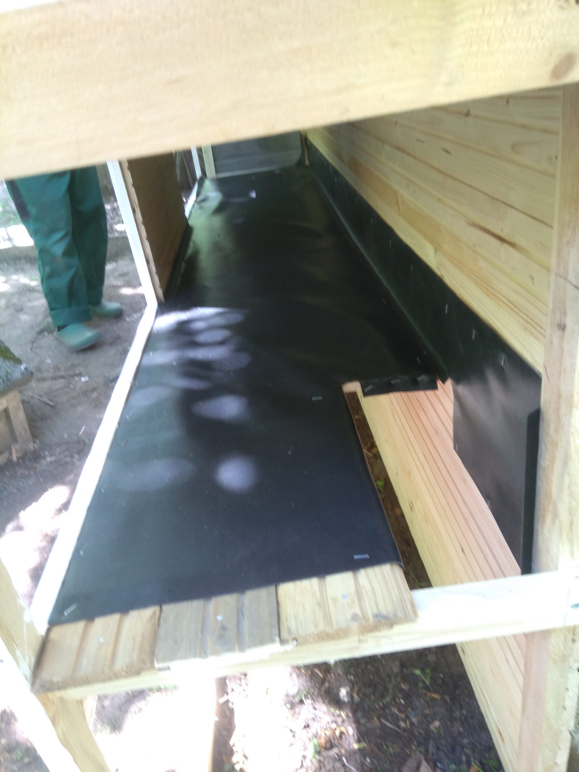 Für den Fußboden kauften wir Teichfolie, da die preiswerter ist als PVC. Mit dem Elektrotacker wurde die Folie als Fußboden verlegt und ein Stück noch an der Wand als Schutz hochgezogen.