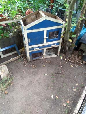 Und das dritte (blaue) Haus war nur noch eine Ruine. Die Anlage war vorletztes Jahr bei einem Sturm umgeweht worden, was ihm endgültig den Rest gegeben hatte. Es war jetzt ein „Lost Place für Meerschweinchen“.