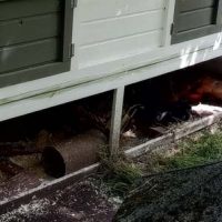 Und das dritte (blaue) Haus war nur noch eine Ruine. Die Anlage war vorletztes Jahr bei einem Sturm umgeweht worden, was ihm endgültig den Rest gegeben hatte. Es ist jetzt ein „Lost Place für Meerschweinchen“.