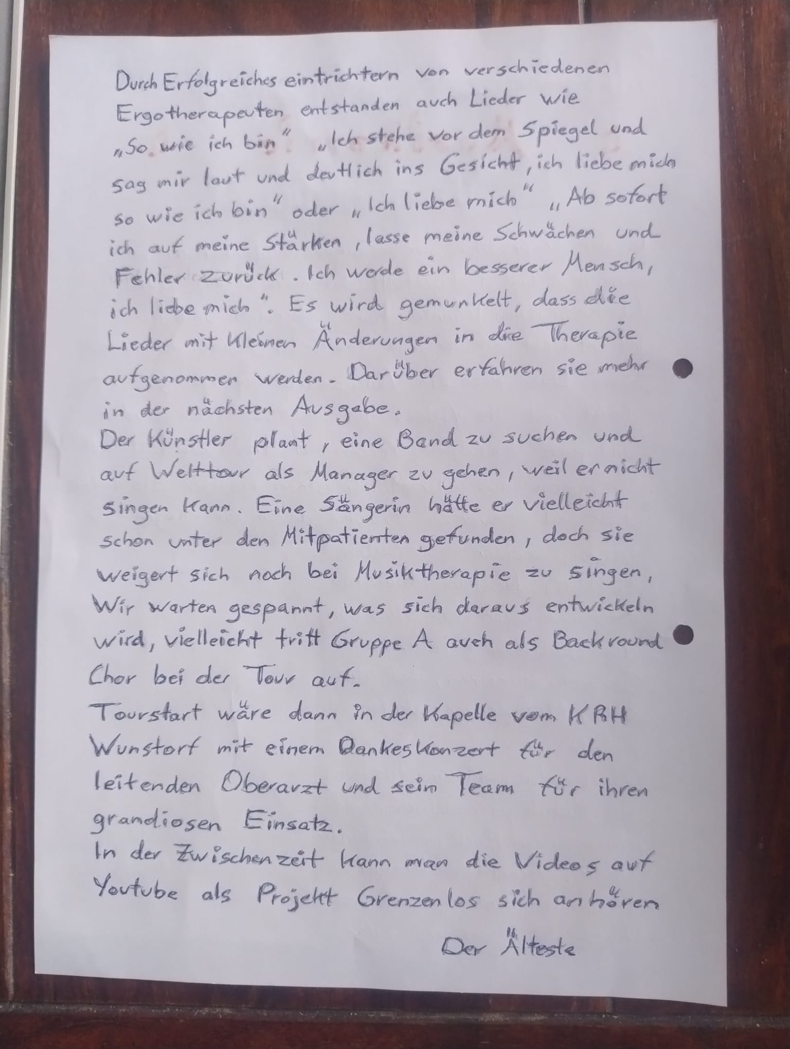 Vor kurzem hat er ein neues unerwartetes Talent bei sich entdeckt. Nun vereint er seine Leidenschaft zur Musik mit eigenen Texten. Bei Youtube ist er unter Projekt Grenzenlos mit seinen Musikvideos anzufinden.