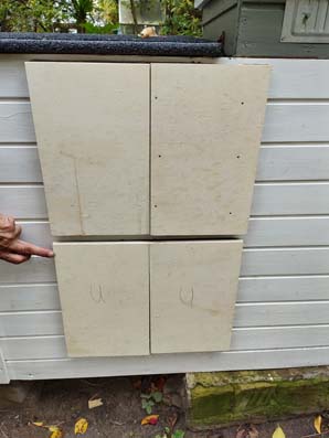 Styropor mussten wir kaufen, aber die Hartfaserplatten lagen direkt vor dem Nachbarhaus auf der Straße. Anscheinend hatte jemand mehrere Kleiderschrankrückenwände entsorgt. Genau das Richtige für uns. Und auch genügend Platten für das Projekt. Wir freuten uns.