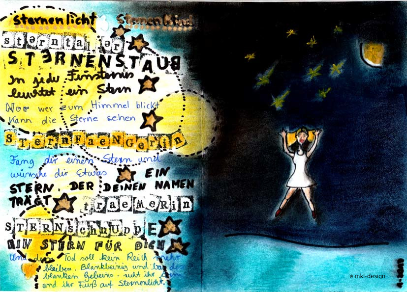 Ich stieß auf wundervolle Collagen, – Mixed Media, – die mit allen möglichen Materialien erstellt wurden, – Bilder mit Texten kombiniert. Ich war fasziniert. Tagelang sah ich mir viele Zeichnungen an, um mir Inspiration zu holen, dabei stieß ich auf eine Künstlerin, Teesha Moore, deren Werke ich ganz besonders mochte. Auf Pinterest findet man viele ihrer Werke, und auch ihre Homepage ist eine Kunst.