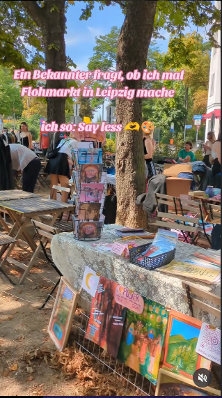 „Seit über einem Jahr verkaufe ich meine Kunst auf Flohmärkten – und jedes Mal erfüllt es mich mit Freude, wenn ich durch meine Werke ein Lächeln, Hoffnung oder ein Stück positive Energie weitergeben darf. Ob mit einer kleinen Postkarte, einem meiner Poesie-Lose oder einer großen Leinwand – Kunst ist für mich Ausdruck dessen, wer ich bin.“