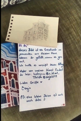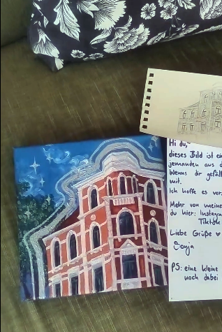 Ein prägnantes Haus in Hannover-Linden regte Sonja zu einer neuen Idee an. Sie malte das Haus und legte das Bild anschließend mit einem netten Brief vor der Haustür für einen unbekannten Bewohner ab. Leider ist mir nicht bekannt, ob es eine Reaktion gab.