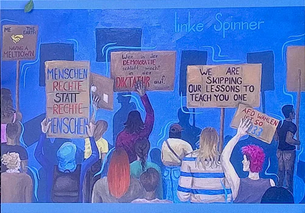 Meine Kunst beschäftigt sich mit Themen, die mich persönlich bewegen. Angst ist oft ein zentrales Gefühl – sei es durch Männer in Machtpositionen, Klimawandel oder Queerfeindlichkeit. Gleichzeitig geht es aber auch um Stärke, Selbstbestimmung und das feiern queeren Lebens.